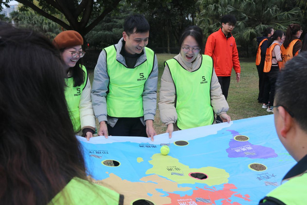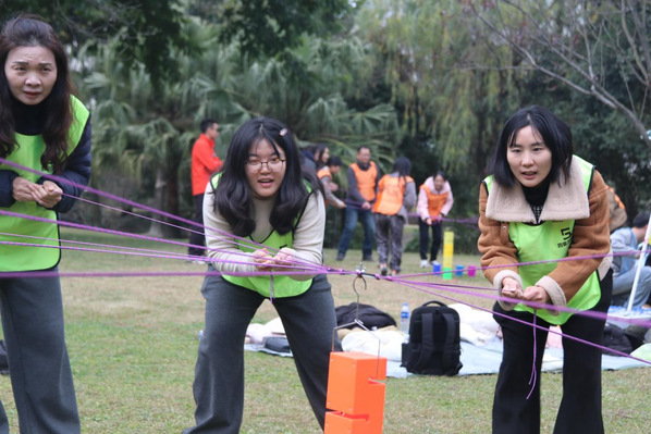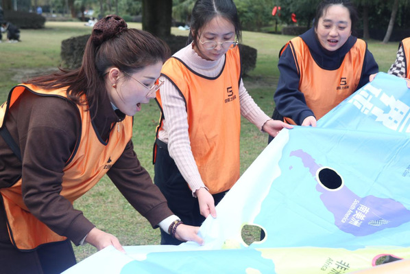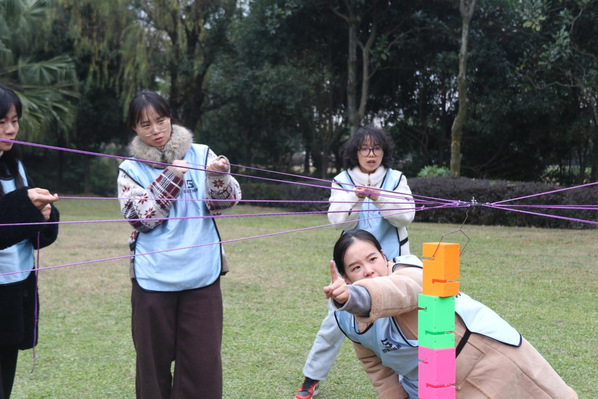 活动于14:30准时开始。在破冰分组环节,老师们通过轻松有趣的互动迅速拉近彼此距离,为后续的团队协作营造了融洽氛围。随后的拓展训练中,在教练的带领下,大家积极参与“环游世界球”“步步高升”“决战沙场”等兼具趣味性与协作性的团队游戏。现场气氛热烈而欢快,欢声笑语不断;老师们在默契配合中深化了理解,在携手挑战中增进了信任。